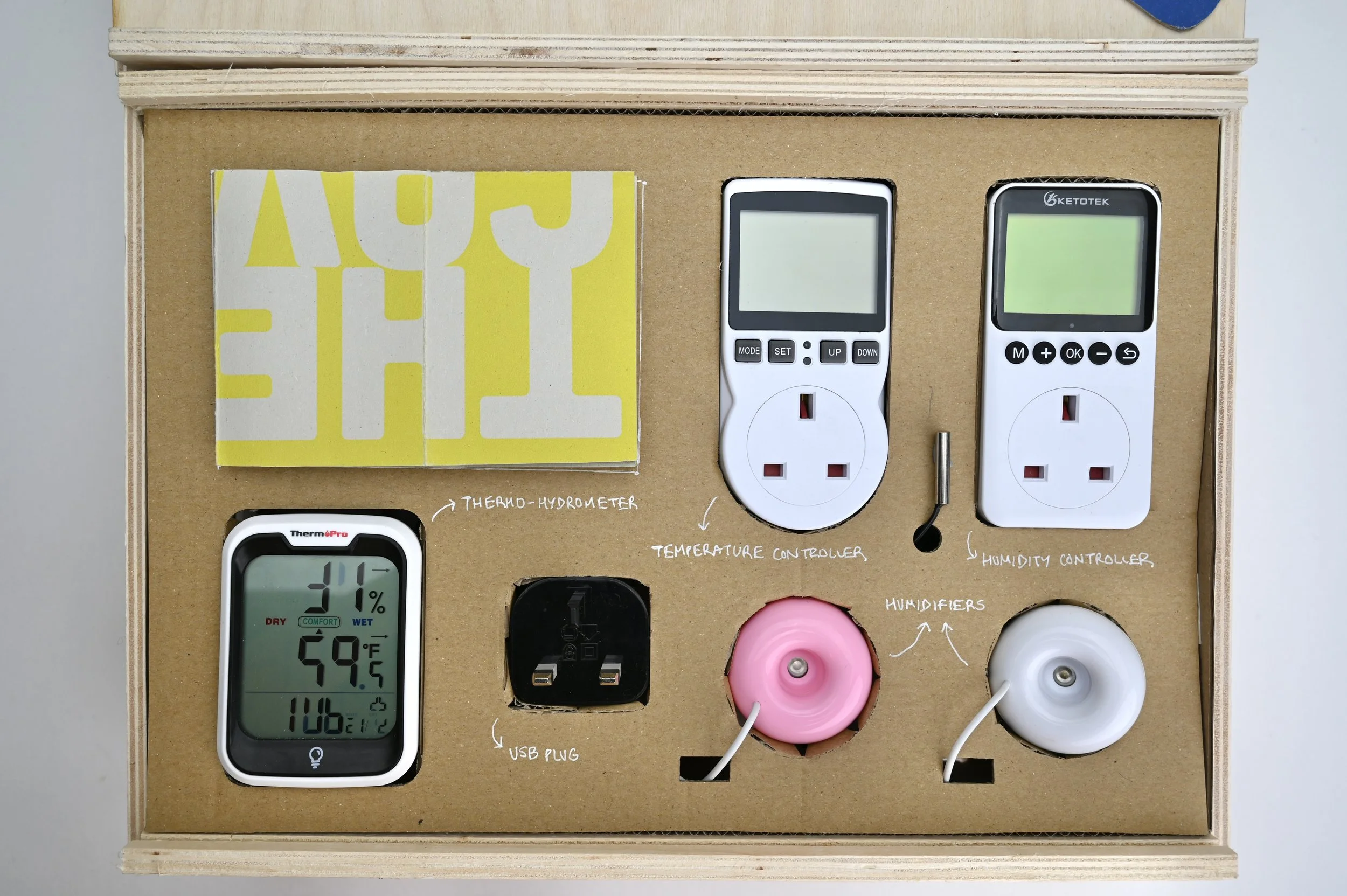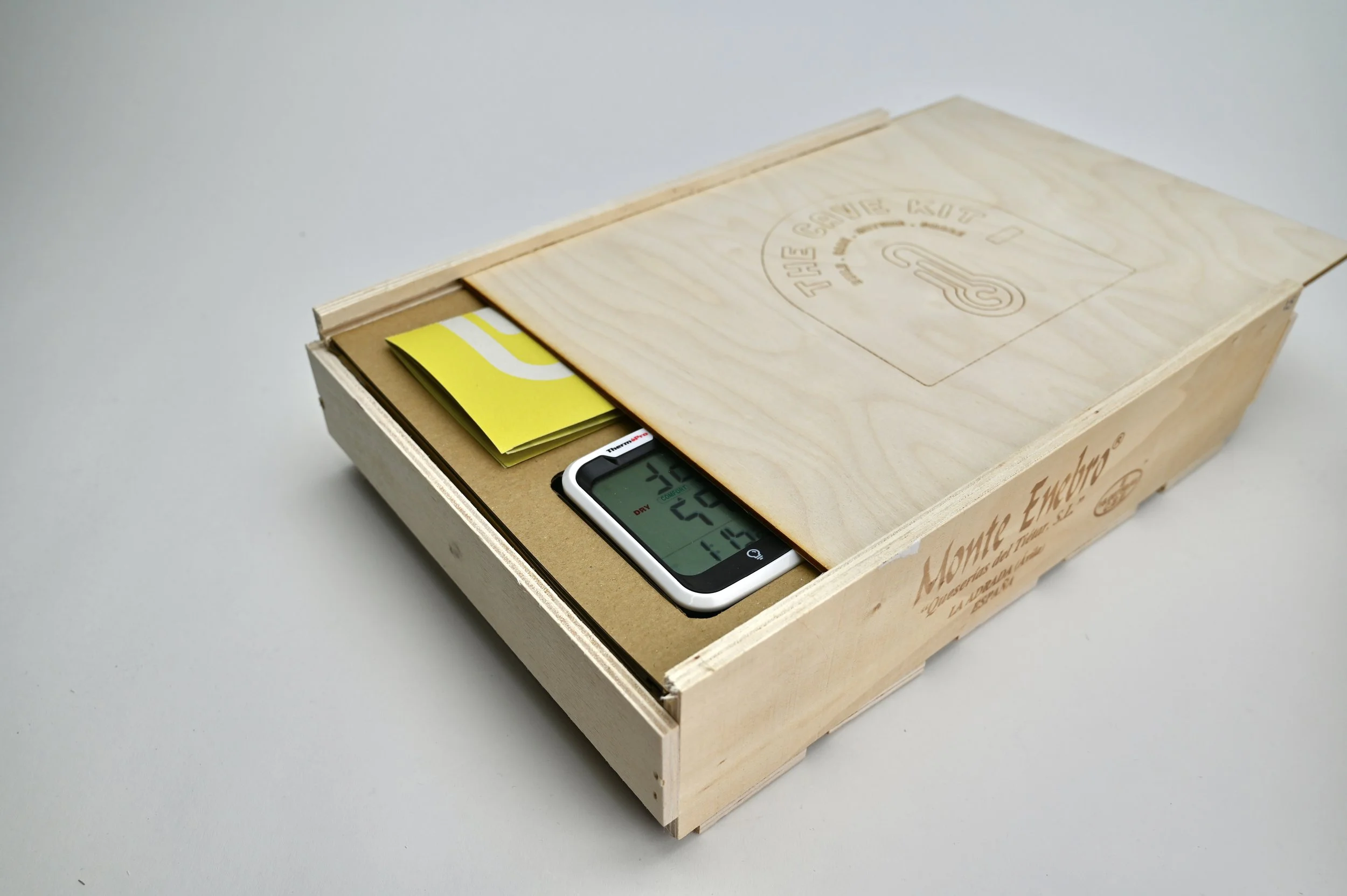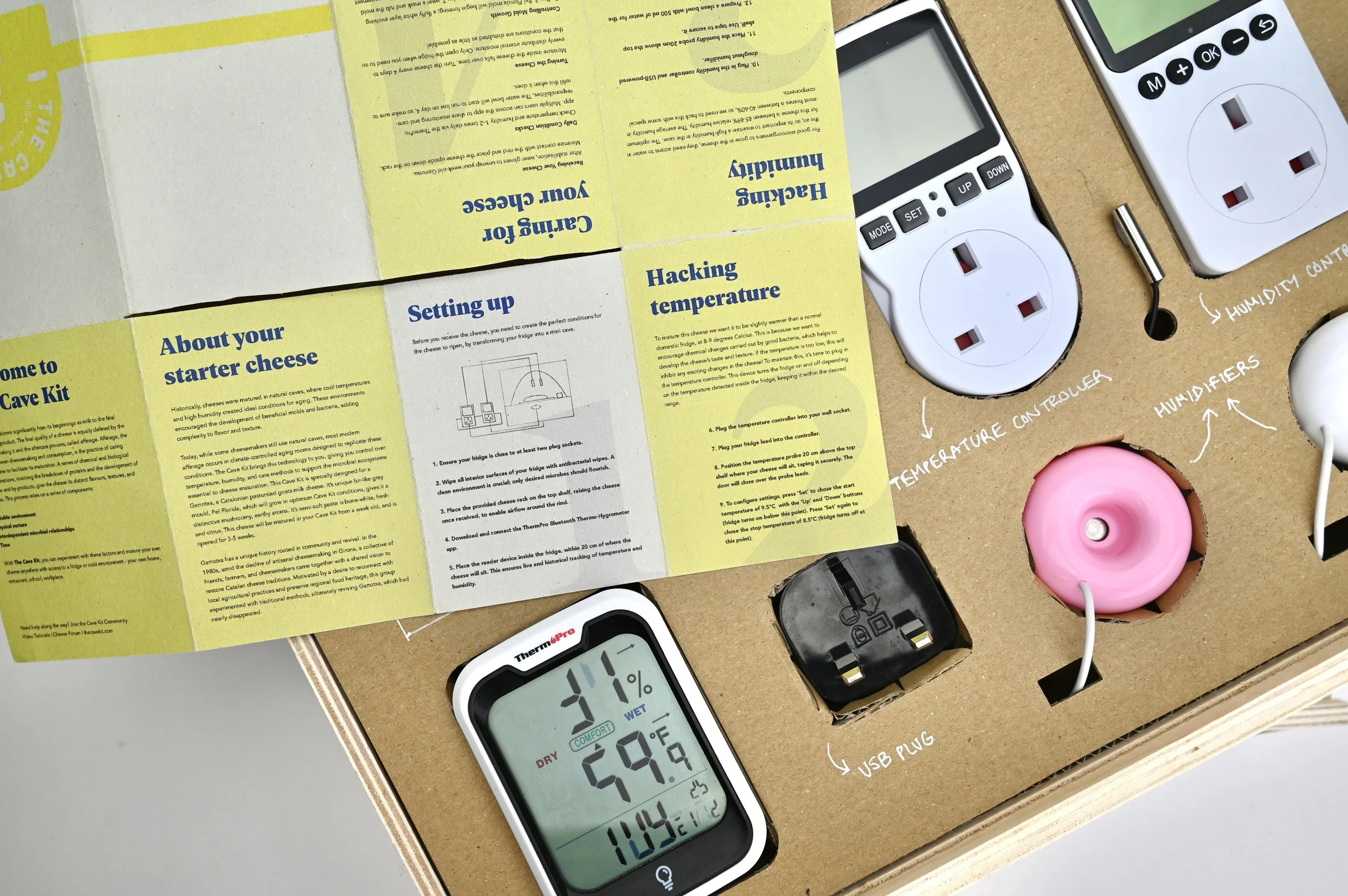 The Cave Kit is a DIY toolkit for turning an ordinary household fridge into a functioning cheese cave. Designed to make the care and maturation of cheese accessible to home enthusiasts, the kit includes a humidifier, temperature and humidity controllers, and guidance for creating the ideal microclimate for affinage. The kit packaging reuses spanish Monte Enebro cheese boxes.