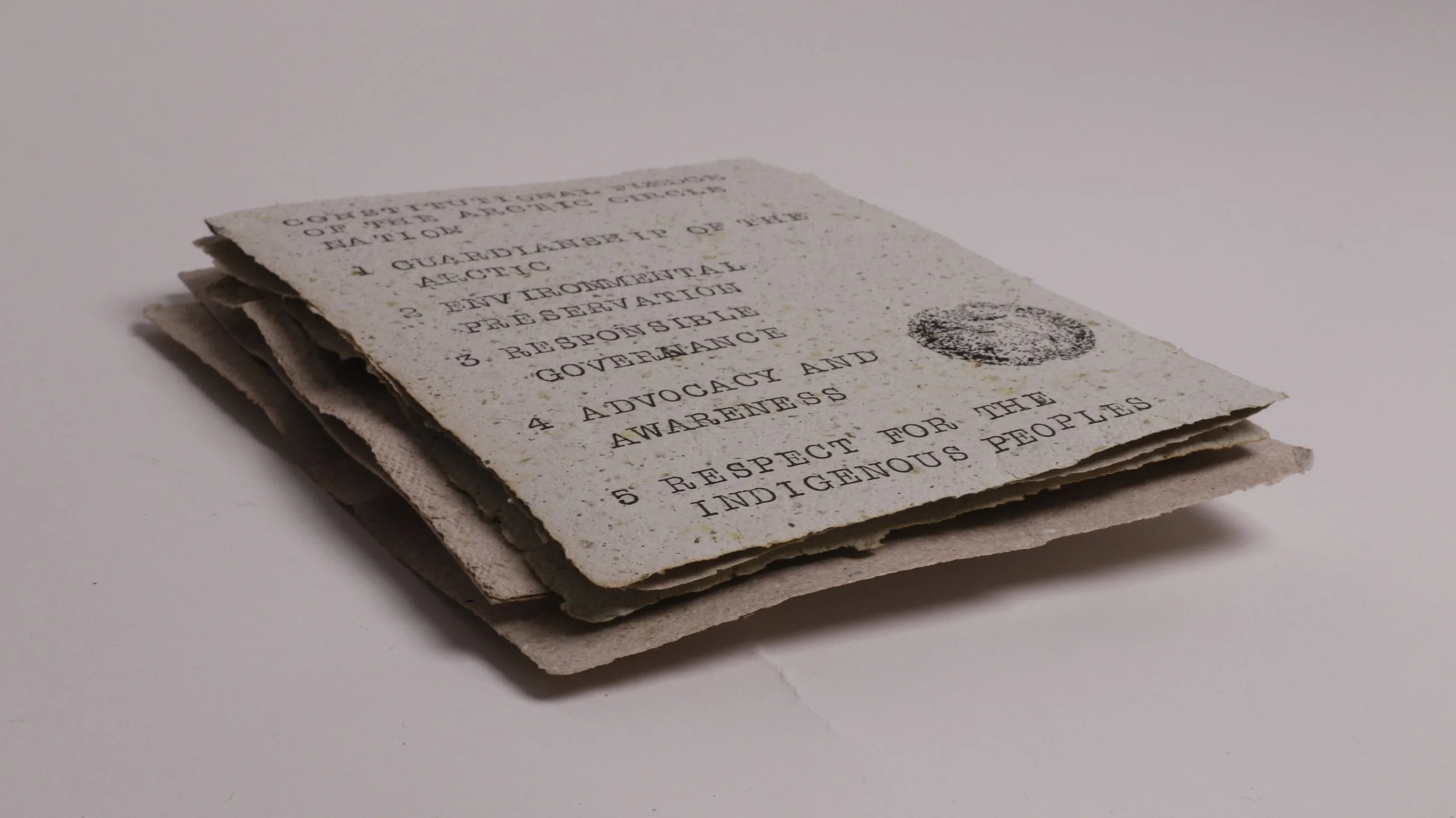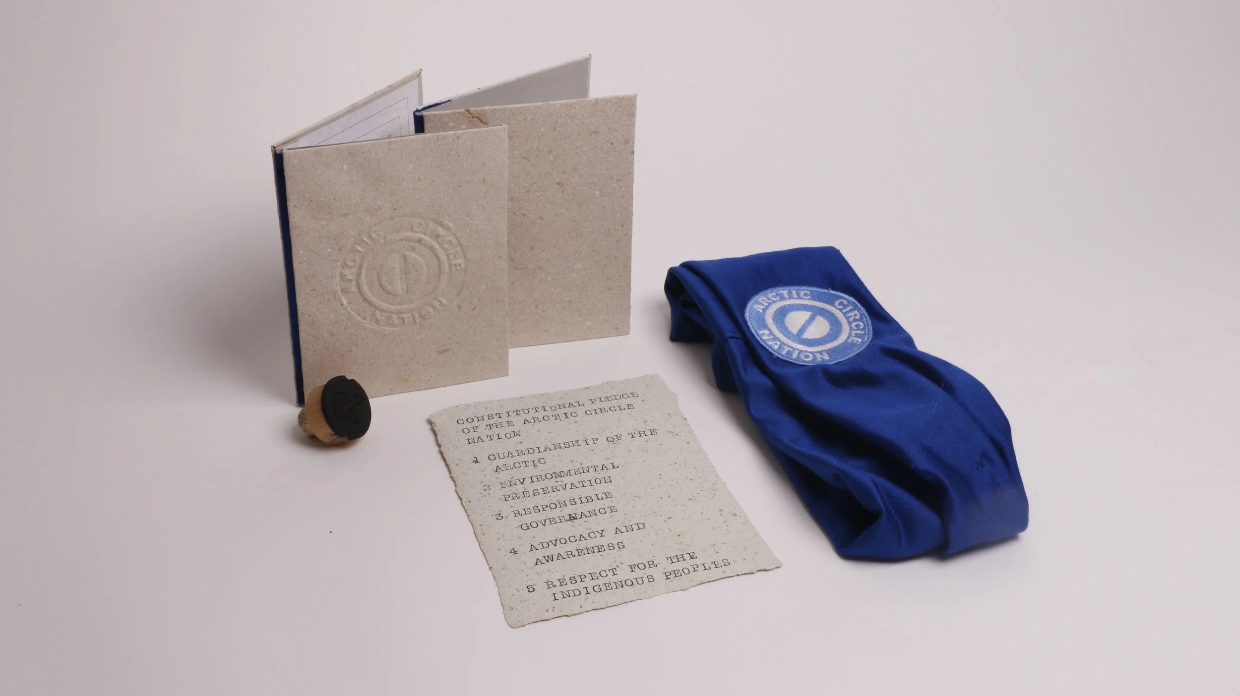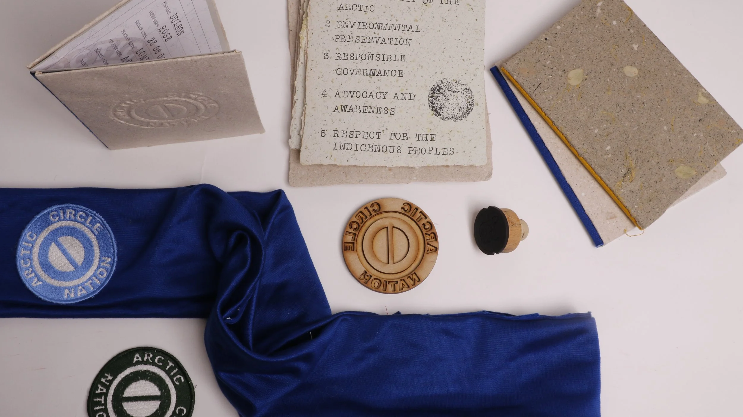 A world building and climate awareness project. During this speculative project, I formed a country in the Arctic on unowned land that is currently being disputed over by the surrounding countries for its natural resources. Posing as another stakeholder in this geopolitical debate, I claimed the arctic for environmental conservation, to protect it from exploitation, like a national-scale nature reserve. I designed the country's principles, the process an individual goes through to gain membership, and the physical artifacts involved in this process.